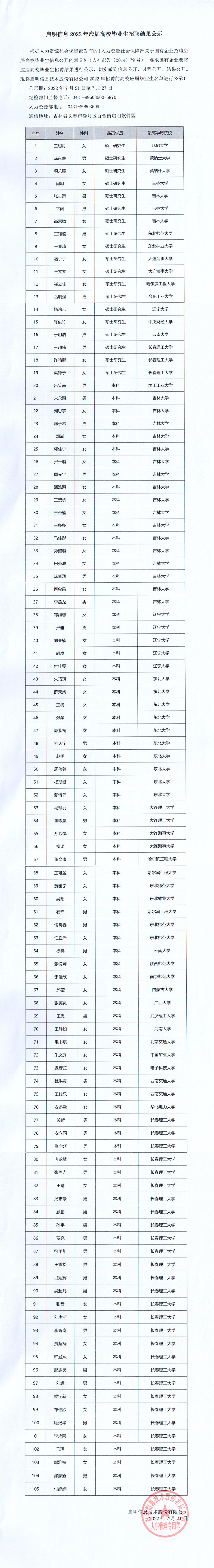 启明信息2022年应届高校毕业生招聘结果公示(第二批)