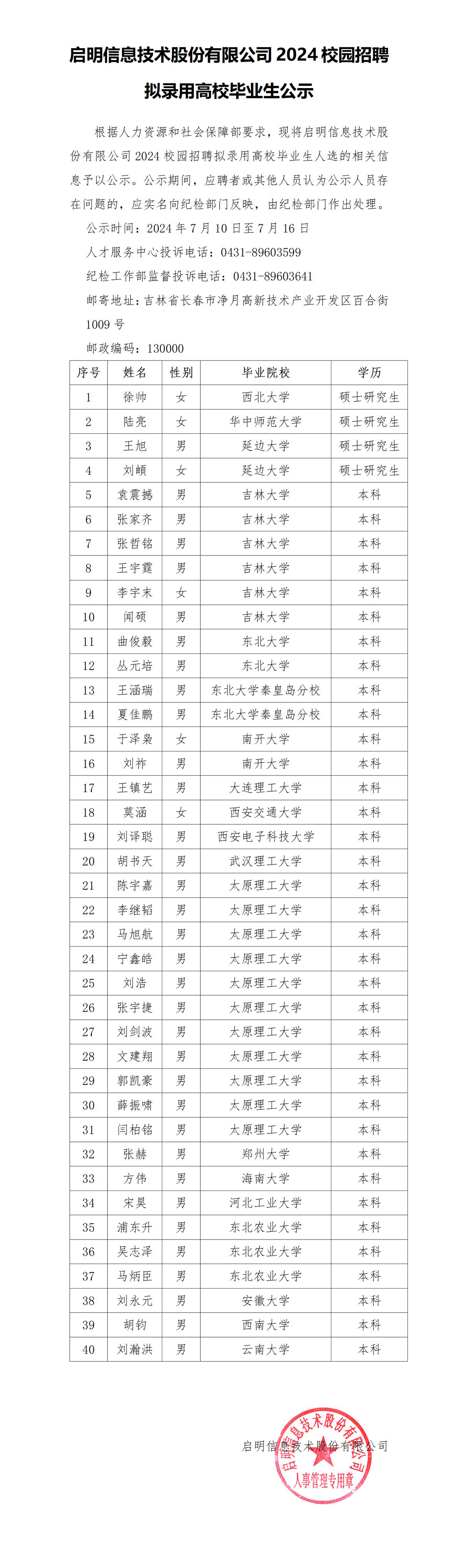 启明信息技术股份有限公司2024校园招聘拟录用高校毕业生公示